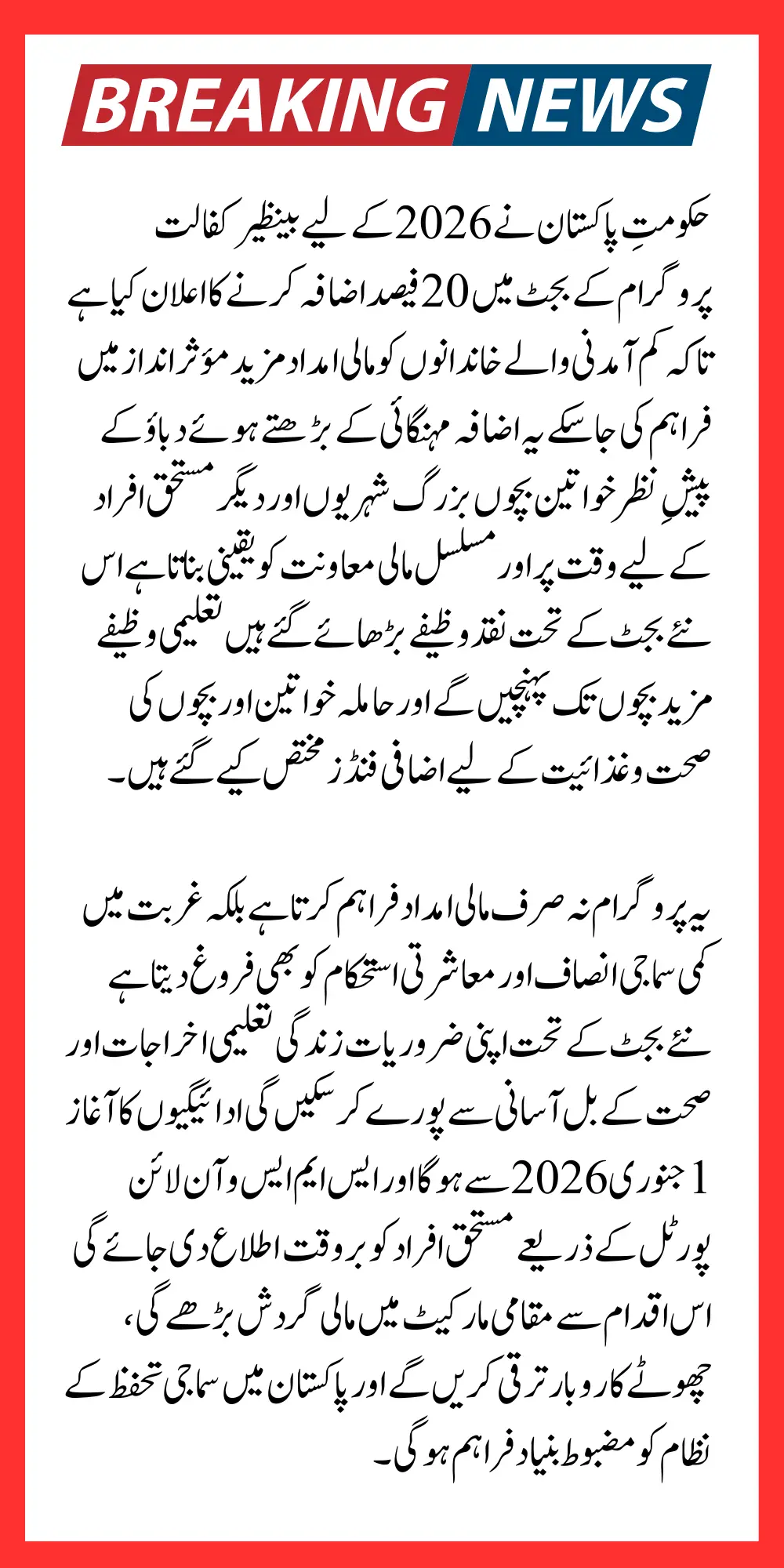 This decision is considered one of the most impactful welfare initiatives for 2026 the increase ensures that women children elderly citizens and financially vulnerable groups receive consistent and timely support By expanding the funding the government is strengthening its commitment to social protection and poverty reduction in Pakistan.