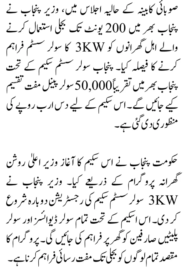 صوبائی کابینہ کے حالیہ اجلاس میں پنجاب کے وزیر نے فیصلہ کیا کہ پنجاب بھر میں 200 یونٹ تک بجلی استعمال کرنے والے اہل گھرانوں کو 3KW کا سولر سسٹم فراہم کیا جائے گا۔ پنجاب سولر سسٹم سکیم کے تحت پنجاب بھر میں تقریباً 50,000 سولر پینل مفت تقسیم کیے جائیں گے۔ اس سکیم کے لیے دس ارب روپے کی منظوری دی گئی ہے۔ حکومت پنجاب نے اس سکیم کا آغاز وزیر اعلیٰ روشن گھرانہ پروگرام کے ذریعے کیا۔ وزیر پنجاب نے 3KW سولر سسٹم سکیم کی رجسٹریشن دوبارہ شروع کر دی۔ اس اسکیم کے تحت تمام سولر ڈیوائسز اور سولر پلیٹیں صارفین کو گھر پر فراہم کی جائیں گی۔ پروگرام کا مقصد تمام لوگوں کو بجلی تک مفت رسائی فراہم کرنا ہے۔