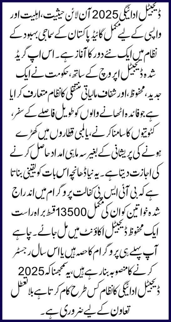 This new structure ensures that women enrolled in the BISP Kafaalat Program receive their full Rs. 13,500 installment directly into a secure digital account. Whether you are already part of the program or planning to register this year, understanding how the 2025 digital payment system works is essential for uninterrupted support.