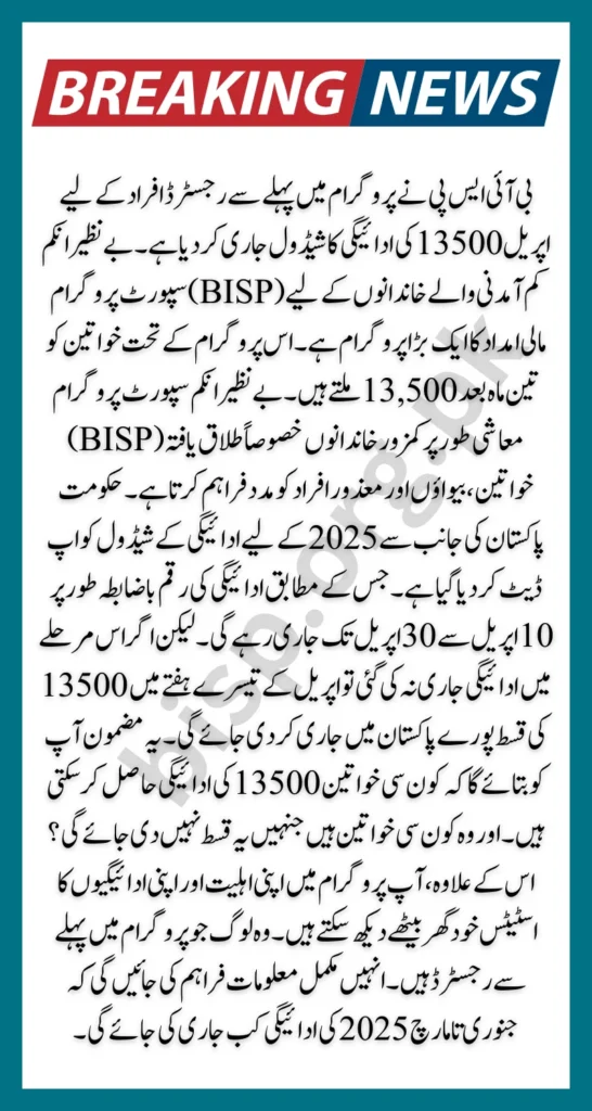 بینظیر انکم سپورٹ پروگرام میں رجسٹرڈ بینظیر انکم سپورٹ پروگرام کے مستفیدین کو تین ماہ کے بعد امداد فراہم کی جاتی ہے۔ حکومت پاکستان نے اپریل2025 کے لیے ادائیگی کا نیا شیڈول جاری کیا ہے۔ وہ تمام خواتین جنہیں جنوری 2025 میں 13500 کی قسط موصول ہوئی ہے، انہیں اپریل کی ادائیگیاں فراہم نہیں کی جائیں گی۔ مارچ کی یہ ادائیگیاں ان خواتین کو فراہم کی جا رہی ہیں جو اس پروگرام میں پہلے سے رجسٹرڈ ہیں۔ جنہوں نے جنوری میں 13500 کی قسط وصول نہیں کی۔ اس کے علاوہ جن خواتین نے حال ہی میں اپنی رجسٹریشن کا عمل مکمل کیا ہے انہیں بھی یہ رقم ملے گی۔
