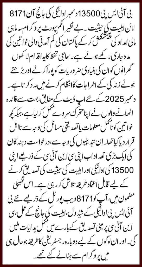 8171 BISP 13500 December Payment Check CNIC Eligibility Status Online. The Benazir Income Support Program (BISP 8171) continues to support Pakistan’s low-income women by offering quarterly financial assistance. This social protection initiative helps millions of households meet their basic needs and manage rising living expenses. As per the new December 2025 update, many beneficiaries have completed their dynamic survey, while some women were marked ineligible due to incomplete information or verification issues. Because of these changes, a large number of applicants are now searching for a reliable way to confirm their BISP 13500 payment and eligibility status through their CNIC.