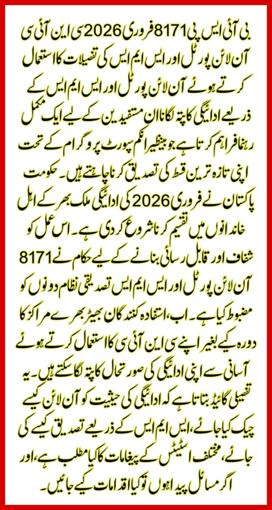 8171 BISP February 2026 Payment Tracking Using CNIC Online Portal & SMS Details Via Online Portal & SMS provides a complete guide for beneficiaries who want to confirm their latest installment under the Benazir Income Support Program. The Government of Pakistan has started distributing the February 2026 payment to eligible families across the country. To make the process transparent and accessible, the authorities have strengthened both the 8171 online portal and SMS verification system.