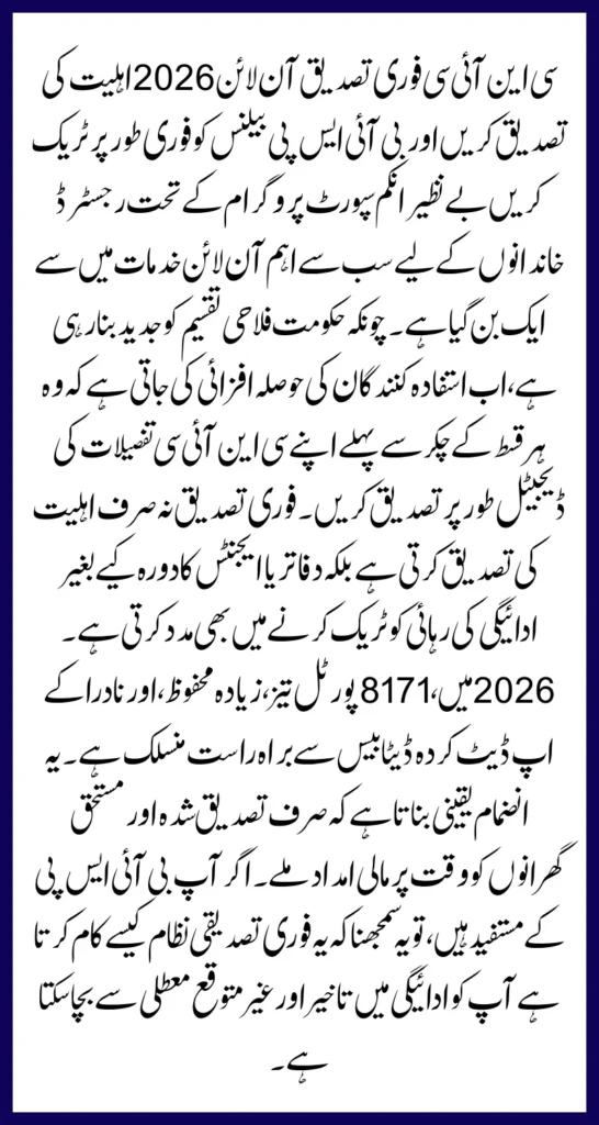 By verifying your CNIC regularly, keeping your records updated, and using only official channels, you can ensure uninterrupted BISP support throughout 2026. Taking a few minutes to check your status today can save you from payment blocks and future complications.