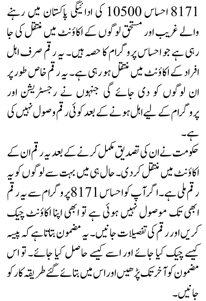 8171 Ehsaas: 8171 Ehsaas 13500 Payment has transferred to the account of poor and deserving people living in Pakistan who are part of the Ehsaas program. This amount is transferring to the account of eligible persons only. This amount will given especially to those who have not received any money after registering and becoming eligible for the program.