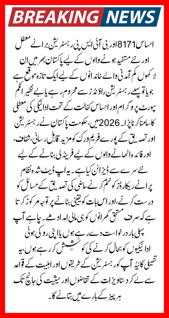 8171 Ehsaas & BISP Registration: 8171 Ehsaas & BISP Registration for Suspended and New Beneficiaries is a fresh opportunity for millions of low-income families across Pakistan who either missed earlier registration rounds or faced payment suspension under the Benazir Income Support Program and Ehsaas Kafalat. In 2026, the Government of Pakistan has redesigned the entire registration and verification framework to make it more accessible, transparent, and beneficiary-friendly.