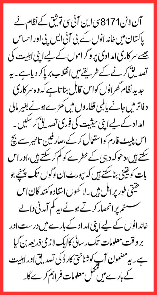 The 8171 Online CNIC Validation System 2026 has revolutionized the way families in Pakistan confirm their eligibility for government support programs such as BISP and Ehsaas. This innovative system enables households to quickly verify their status for financial assistance without visiting government offices or standing in long queues. By using this platform, users can avoid delays, reduce the risk of fraud, and ensure that support reaches those who genuinely qualify.