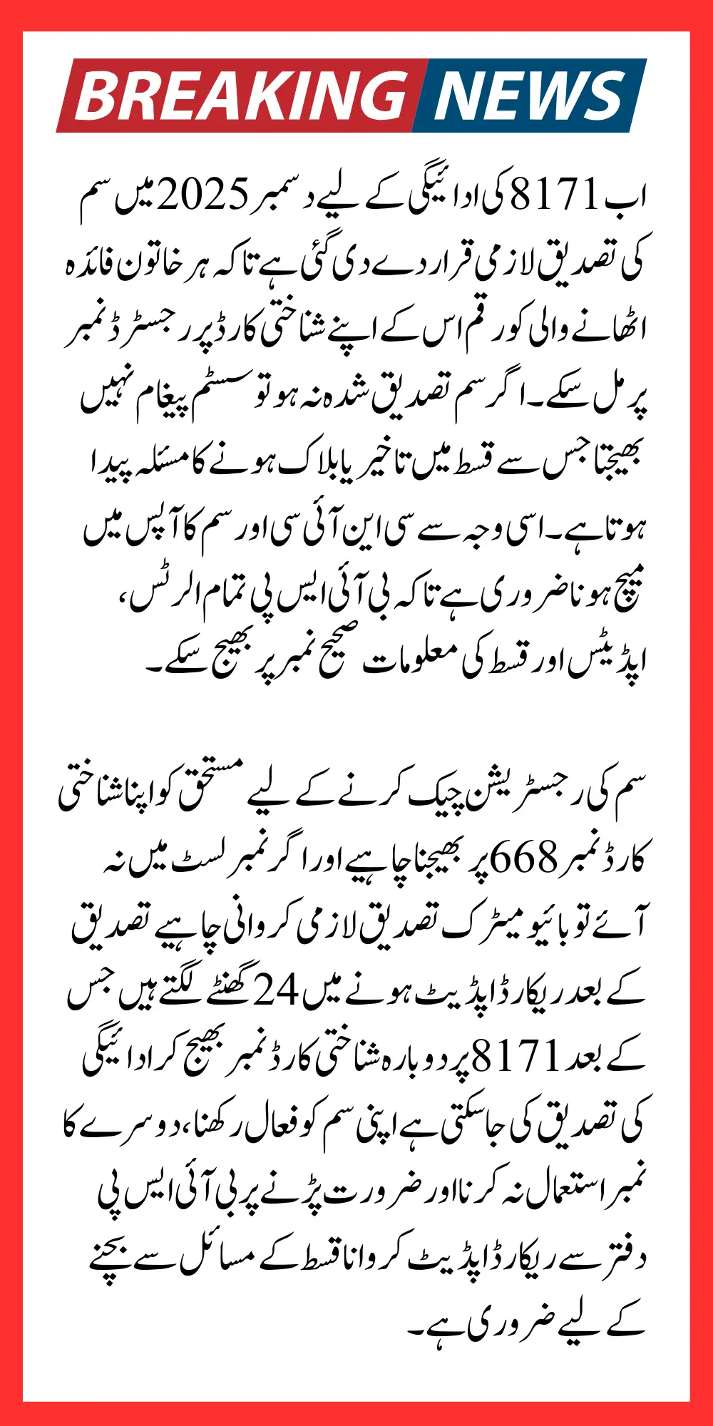 8171 Payment December 2025 SIM Verification: 8171 SIM verification process has been made compulsory in December 2025 to ensure that all BISP beneficiaries receive their payments been introduced after several years of reported issues where beneficiaries faced delays or missed installments due to unverified SIM the new system helps confirm that only the rightful recipient receives the installment on the number registered under their CNIC.