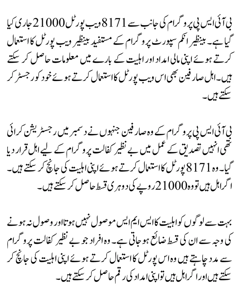 • You can check your eligibility for the Benazir Kafalat program using the 8171 web portal to see if you are eligible for the BISP program.
