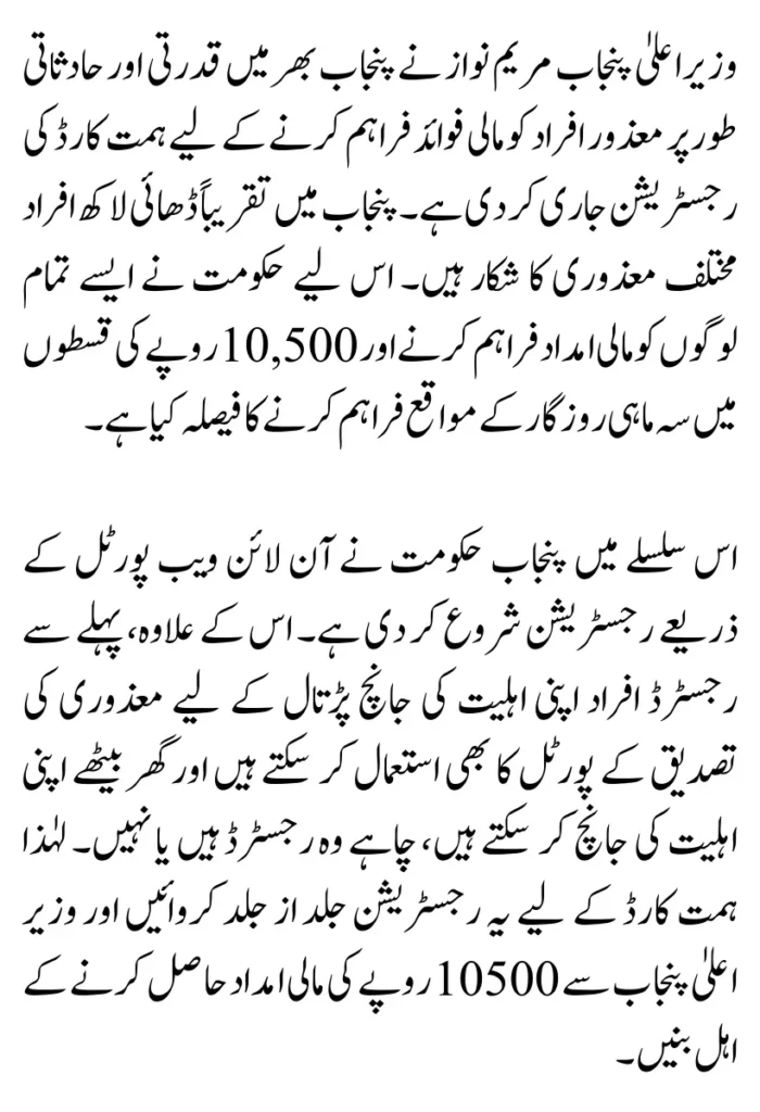 Chief Minister Punjab Maryam Nawaz has issued a Himmat Card Registration to provide financial benefits to people with natural and accidental disabilities across Punjab. Nearly two and a half million people in Punjab suffer from various disabilities. Therefore, the government has decided to provide financial assistance to all such people and to provide employment opportunities quarterly in installments of Rs.10,500.