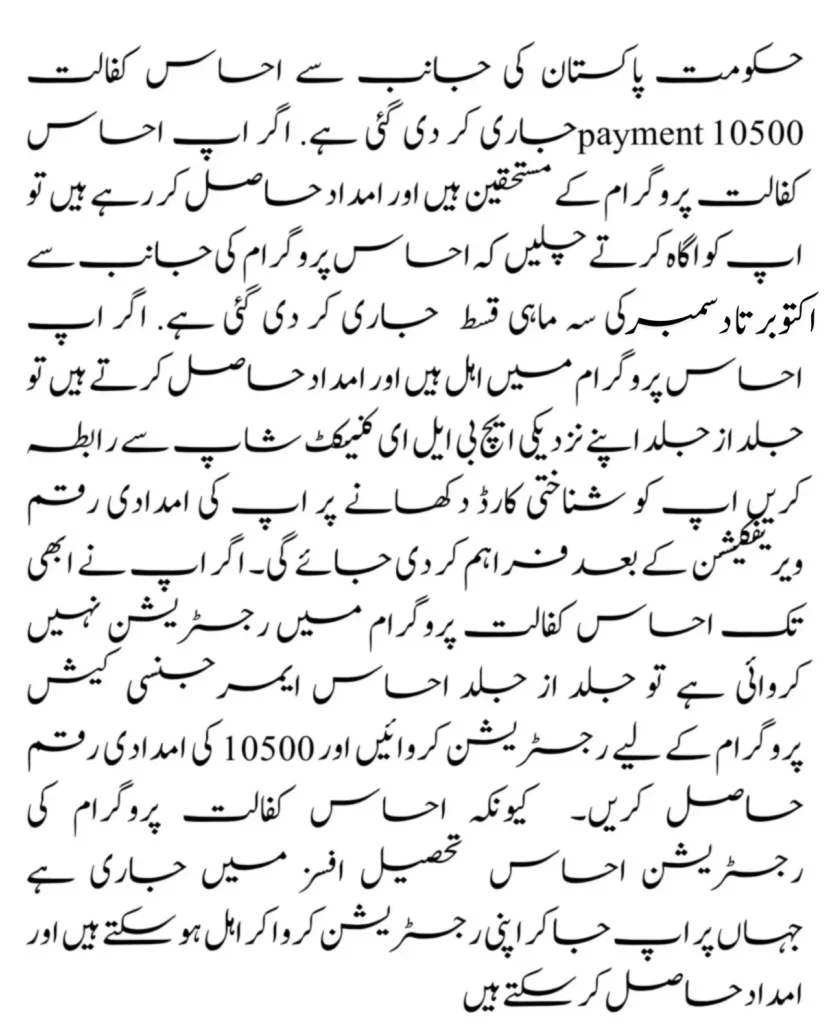 احساس ایمرجنسی کیش پروگرام نے جولائی تا ستمبر قسطیں جاری کر دی ہیں۔ وہ لوگ جو احساس کفالت پروگرام کے تحت رجسٹرڈ اور اہل قرار دیے گئے ہیں۔ وہ اپنی سہ ماہی اقساط اپنے قریبی ’’بی ایل کنیکٹ شاپ‘‘ سے حاصل کر سکتے ہیں۔ اگر آپ نے این ایس ای آر سے تصدیق بھی کرائی ہے تو قسط لینے سے پہلے۔ آپ کو اوپر دیے گئے 8171 ویب پورٹل کے ذریعے اپنی اہلیت کی جانچ کرنی ہوگی اور امداد کی قسط لینے کے لیے جانا ہوگا۔ کیونکہ بہت سے لوگ احساس کفالت پروگرام سے باہر ہو چکے ہیں۔ کیونکہ وہ سرکاری ملازمت کے حامل تھے اور اس پروگرام کے اہل نہیں تھے۔ لہذا اپنی اہلیت کی جانچ کریں کیونکہ اگر آپ اہل نہیں ہیں، تو آپ کو E-connect کی دکان پر مسائل کا سامنا کرنا پڑے گا۔