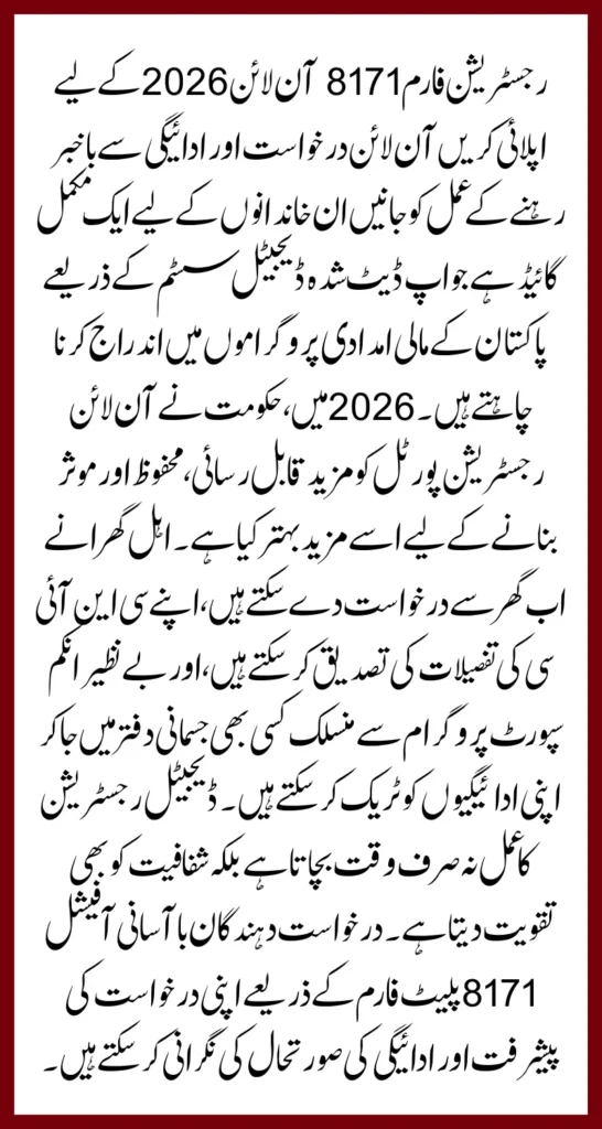 Apply for 8171 Registration Form Online 2026 Know Online Application & Payment Tracking Process is more than just a digital upgrade; it is a step toward transparent and efficient welfare management in Pakistan. By allowing families to register, verify eligibility, and track payments online, the system reduces delays and increases fairness. Families who meet the eligibility criteria should carefully complete the online form, provide accurate information, and monitor their status regularly. With proper documentation and attention to detail, applicants can benefit from timely financial support under the Benazir Income Support Program. The 2026 digital system ensures that assistance reaches deserving households in a secure, efficient, and transparent manner.