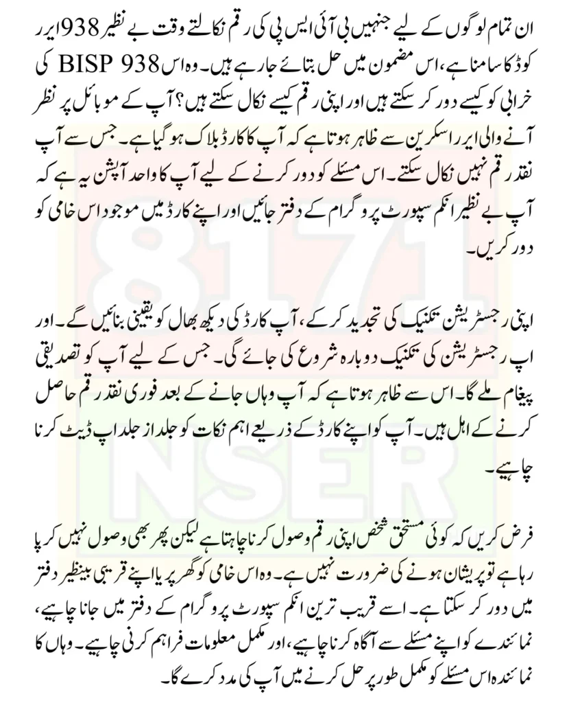 یہ مضمون ان تمام لوگوں کے لیے حل فراہم کرتا ہے جنہیں BISP رقم نکالتے وقت بے نظیر 938 ایرر کوڈ کا سامنا کرنا پڑتا ہے۔ وہ اس BISP 938 کی خرابی کو کیسے دور کر سکتے ہیں اور اپنی رقم کیسے نکال سکتے ہیں؟ آپ کے موبائل پر نظر آنے والی ایرر اسکرین اس بات کی نشاندہی کرتی ہے کہ آپ کا کارڈ بلاک کر دیا گیا ہے، اس لیے آپ نقد رقم نہیں نکال سکتے۔ اس مسئلے کو دور کرنے کے لیے آپ کا واحد آپشن یہ ہے کہ آپ بے نظیر انکم سپورٹ پروگرام کے دفتر جائیں اور اپنے کارڈ پر موجود اس خامی کو دور کریں۔