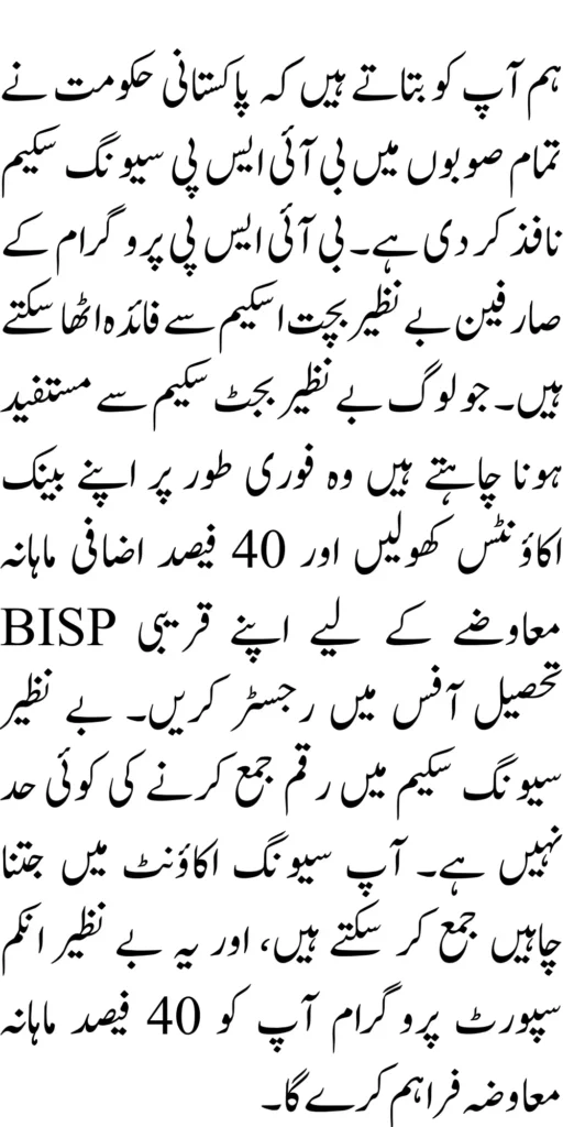 آپ کو بتاتے چلیں کہ پاکستانی حکومت نے تمام صوبوں میں بی آئی ایس پی سیونگ سکیم نافذ کر دی ہے۔ بی آئی ایس پی پروگرام کے صارفین بے نظیر بچت اسکیم سے فائدہ اٹھا سکتے ہیں۔ جو لوگ بے نظیر بچیٹ سکیم سے مستفید ہونا چاہتے ہیں وہ فوری طور پر اپنے بینک اکاؤنٹس کھولیں۔ اور 40 فیصد اضافی ماہانہ معاوضے کے لیے اپنے قریبی بی آئی ایس پی تحصیل آفس میں رجسٹر کریں۔ بے نظیر بچت اسکیم میں رقم جمع کرنے کی کوئی حد نہیں ہے۔ آپ سیونگ اکاؤنٹ میں جتنا چاہیں جمع کر سکتے ہیں، اور یہ بی آئی ایس پی پروگرام آپ کو 40 فیصد ماہانہ معاوضہ فراہم کرے گا۔