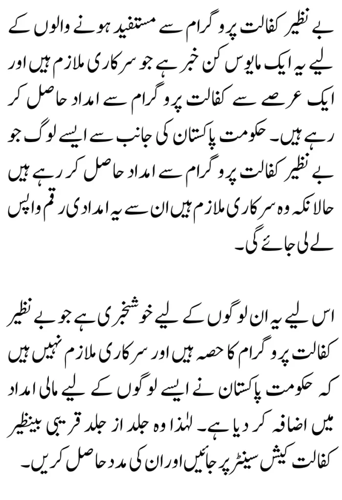 It is a piece of disappointing news for the beneficiaries of the Benazir Kafalat program who are government employees and have been receiving assistance from the Kafalat program for a long time. On behalf of the government of Pakistan, such people who are receiving aid from the Benazir Kafalat program even though they are government employees will withdraw this assistance money from them.
