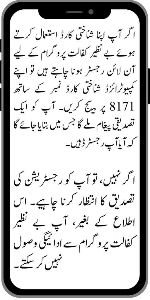 If you wish to register for the Benazir Kafalat program online using your CNIC, send a message to 8171 with your computerized identity card number. You will receive a confirmation message indicating whether you have been registered.