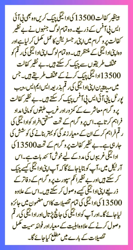 13500 payment under Benazir Kafalat program is a welcome thing to help poor people. In this article, you will told how you can check your payment and receive your payments through the Benazir Income Support Program offices. Apart from this, all the details of the payment of 13500 will reviewed in this article. And you will informed about the complete details including eligibility criteria and benefits apart from checking the payment and receiving the payment amount.