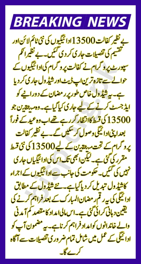 Benazir Kafalat 13500 Payments: Benazir Kafalat 13500 Payments New Timeline and Distribution Details Released. The Benazir Income Support Program has released the latest update and schedule regarding the payments of the Kafalat program. This schedule has been released specifically to accommodate the Ramadan period. Beneficiaries who were waiting for the installment of 13500. They will now be able to receive their payment immediately after Eid. A new installment of 13500 has been fixed for the beneficiaries under the Benazir Kafalat Program. But its payments have not been released yet. The schedule for releasing payments has been changed by the government.