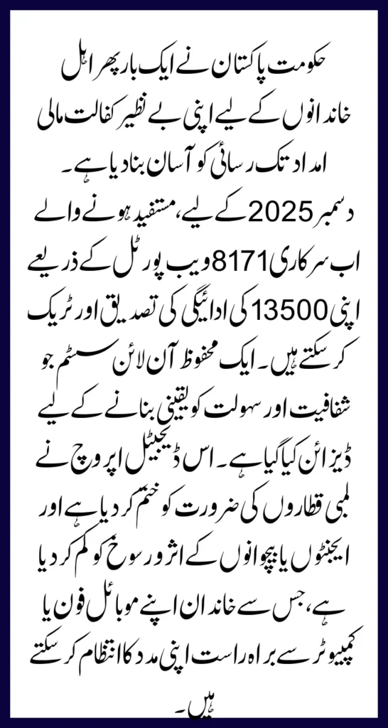 Benazir Kafalat 8171: The Government of Pakistan has once again made it easier for eligible families to access their Benazir Kafalat financial support. For December 2025, beneficiaries can now confirm and track their Rs. 13,500 payment through the official 8171 Web Portal. A secure online system designed to ensure transparency and convenience. This digital approach has removed the need for long queues and reduced the influence of agents or intermediaries, allowing families to manage their assistance directly from their mobile phones or computers.