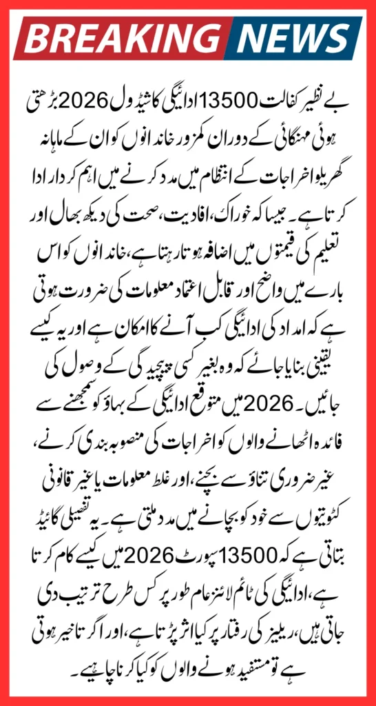 Understanding the expected payment flow in 2026 helps beneficiaries plan expenses, avoid unnecessary stress, and protect themselves from misinformation or illegal deductions. This detailed guide explains how the 13500 PKR support works in 2026, how payment timelines are usually structured, what affects release speed, and what beneficiaries should do if delays occur.
