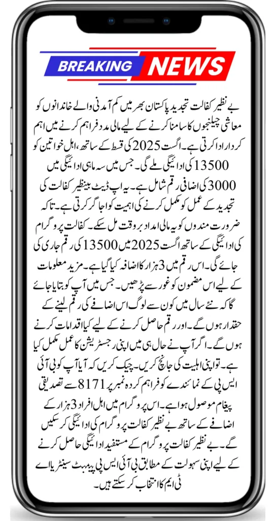 Benazir Kafalat Renewal: Benazir Kafalat Renewal plays an important role in providing financial support to low-income families across Pakistan to face economic challenges. With the August 2025 installment, eligible women will get a payment of 13,500. In which the quarterly payment includes an additional amount of 3000. This update highlights the importance of completing the Benazir kafalat renewal process. In order to ensure that the needy people get this financial assistance in time. An amount of 13500 will be released in August 2025 with the payment of the kafalat program. This amount has been increased by 3 thousand. Read this article carefully for more information. In which you will be told which people will entitled to take this amount of increase in the new year.