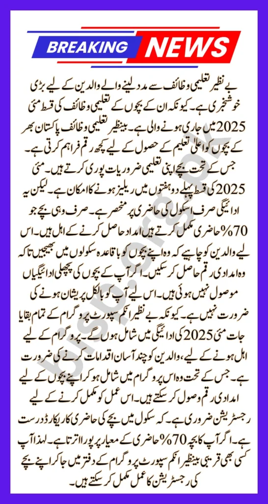 So you don’t need to worry at all. Because all arrears from the Benazir Income Support Program will included in the May 2025 payment. To qualify for the program, parents need to take a few simple steps. Under which they can join the program and receive aid money for their children. Registration has required to complete the process. That the attendance record of the child in the school is correct. If your child meets the 70% attendance criteria. So you can go to any nearby Benazir Income Support Program office and complete the registration process of your child.