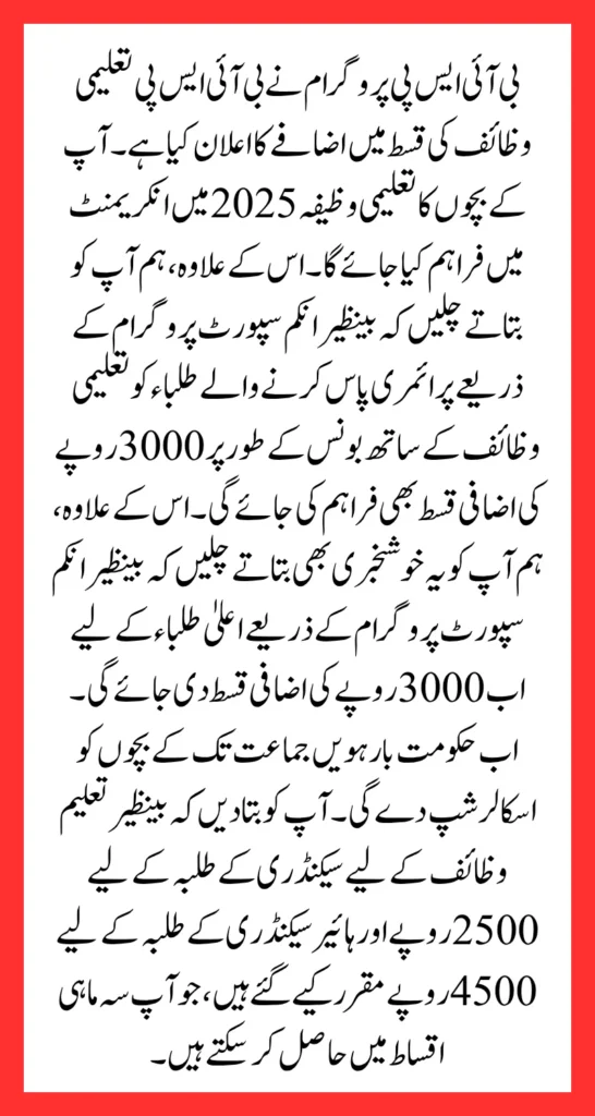 بی آئی ایس پی پروگرام نے بی آئی ایس پی تعلیم وظیف کی قسط میں اضافے کا اعلان کیا ہے۔ آپ کے بچوں کا تعلیم وظیفہ 2025 میں انکریمنٹ میں فراہم کیا جائے گا۔ اس کے علاوہ، ہم آپ کو بتاتے چلیں کہ بینظیر انکم سپورٹ کے ذریعے پرائمری پاس کرنے والے طلباء کو تعلیم وظائف کے ساتھ بونس کے طور پر 3000 روپے کی اضافی قسط فراہم کی جائے گی۔ پروگرام. بی آئی ایس پی تعلیم وظیف کے ساتھ ساتھ بے نظیر احساس کفالت پروگرام کی قسطوں میں بھی اضافہ کر دیا ہے۔ تو اب آپ کو بے نظیر کفالت پروگرام کے تحت 10500 روپے کی بجائے سہ ماہی قسط کے طور پر پورے 13500 روپے ملیں گے۔