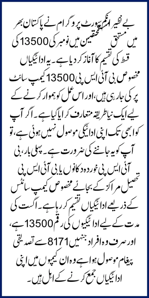 For the first time, BISP is distributing payments through designated campsites instead of retail shops or BISP Tehsil centers. The payments amount to 13500 for the November period, and only individuals who have received a confirmation message from 8171 are eligible to collect their payments at these camps.