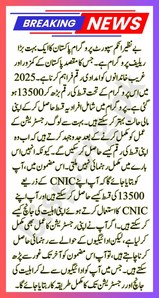 Benazir Income Support Program (BISP) 13500 is a lifeline for the poorest families in Pakistan. After completing the registration process in the program and verifying eligibility, eligible individuals can receive a payment of 13500. By following the correct procedure for receiving payments, beneficiaries can easily receive their assistance. This article tells you how you can receive assistance of 13500 through your CNIC. Because the CNIC-based payment system ensures transparency. Which helps ensure that the assistance amount is delivered to the actual beneficiaries. If you or anyone you know is extremely poor or eligible for the program. Then complete the registration process today and get your BISP financial assistance.