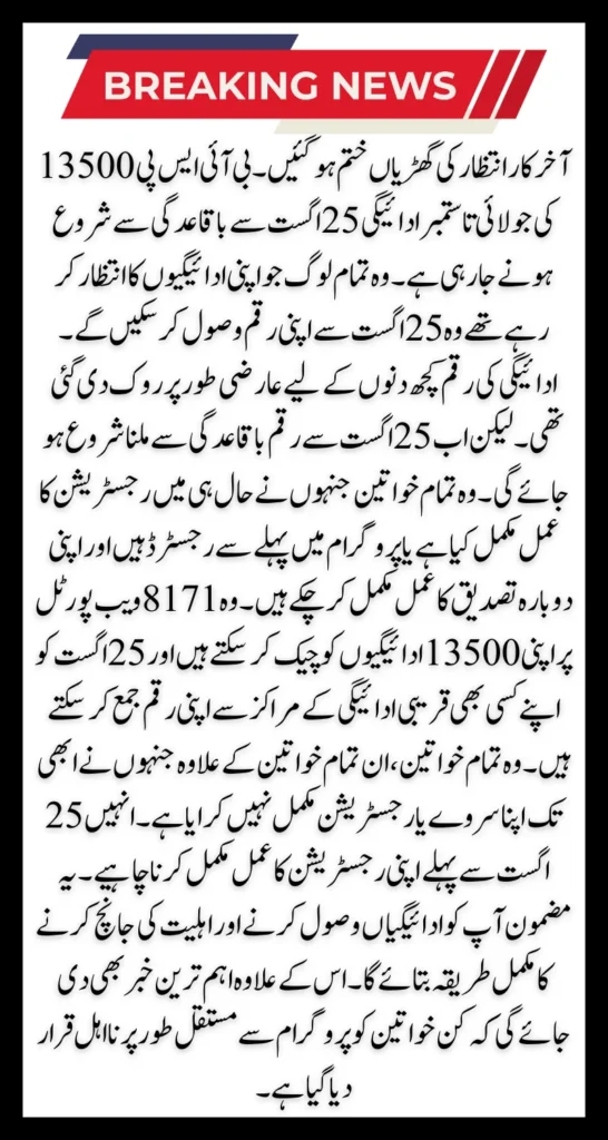 There is great news for the beneficiaries of the Benazir Income Support Program. Because their July To September installment of 13500 will resume regularly from August 25. Women who have recently completed their registration process. Or women who have already benefited from the program and have received a message for the payment of 13500. They will be able to receive their payments regularly after August 25. But those women who have not yet completed their verification process. They are instructed to get their verification done before August 25. Because after that they will be delisted from the program. If you also want to get assistance from the program, get your registration done before August 25. So that you can start receiving August payments officially.