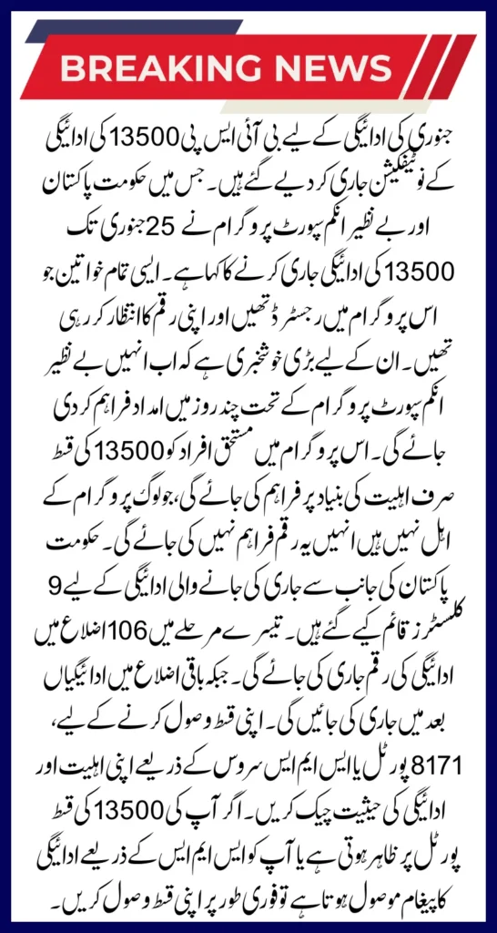 9 clusters have been established for the payment to be released by the Government of Pakistan. In the third phase, the payment amount will be released in 106 districts. While the payments in the remaining districts will be released later. To receive your installment, check your eligibility and payment status through the 8171 portal or SMS service. If your installment of 13500 appears on the portal or you receive a payment message via SMS, receive your installment immediately.