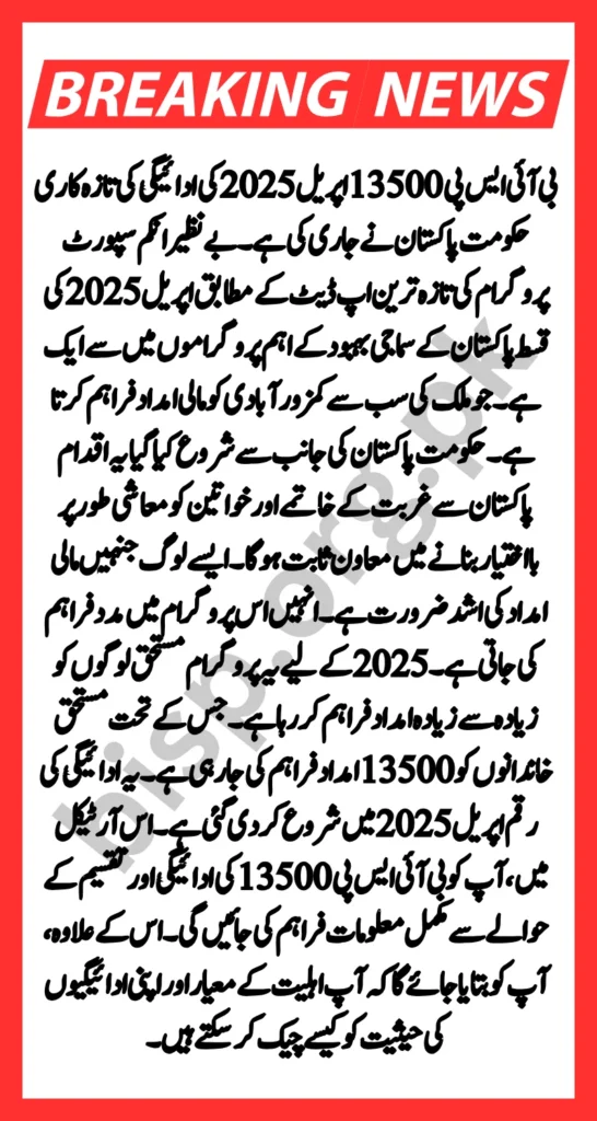 The main objective of this initiative is to provide assistance to the beneficiaries of the program by determining their eligibility. Deserving people go through a verification process to determine their eligibility. This is then followed by ensuring that the aid amount is distributed fairly to the beneficiaries. This payment amount has been started in April 2025. In this article, you will be provided with complete information regarding the payment and distribution of BISP 13500. In addition, you will be told how you can check the eligibility criteria and the status of your payments.
