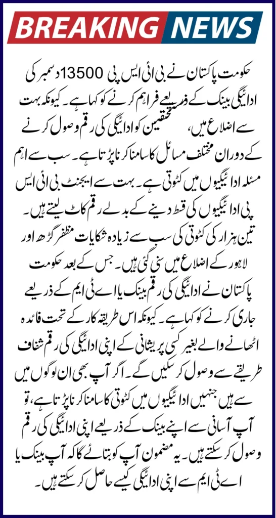 بے نظیر انکم سپورٹ پروگرام نے 13500 کی قسط شروع کر دی ہے۔ لیکن بہت سے مستفیدین کو دسمبر میں دو قسطیں فراہم کی جائیں گی۔ یہ وہ مستحقین ہیں جنہیں پچھلے مرحلے میں 13500 کی قسط فراہم نہیں کی گئی تھی۔ انہیں 13500 کی پہلی قسط کے ساتھ دوسرے مرحلے کی ادائیگی فراہم کی جائے گی۔