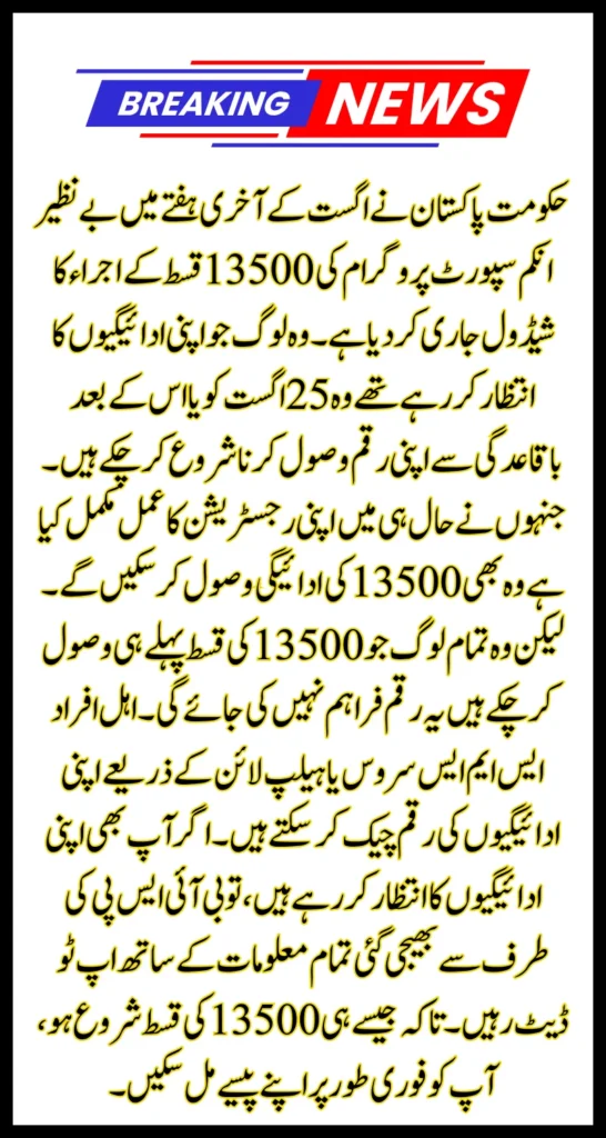 حکومت نے باضابطہ طور پر بی آئی ایس پی 8171 اگست13500 کی ادائیگی کا اعلان کیا ہے۔ بے نظیر انکم سپورٹ پروگرام کے رجسٹرڈ افراد باقاعدگی سے 13500 کی قسط کے منتظر تھے۔ لیکن امداد کی رقم ابھی تک انہیں جاری نہیں کی گئی۔ اب حکومت نے باضابطہ اعلان کیا ہے کہ مستحق افراد کو اگست کے دوسرے ہفتے میں 13500 کی قسط ملنا شروع ہو گئی ہے۔ مستحق افراد یہ رقم 25 اگست سے وصول کرنا شروع کر چکے ہیں۔ بے نظیر انکم سپورٹ پروگرام پاکستان میں غریب اور مستحق لوگوں کی مدد کے لیے ایک بہت بڑا امدادی پروگرام ہے۔