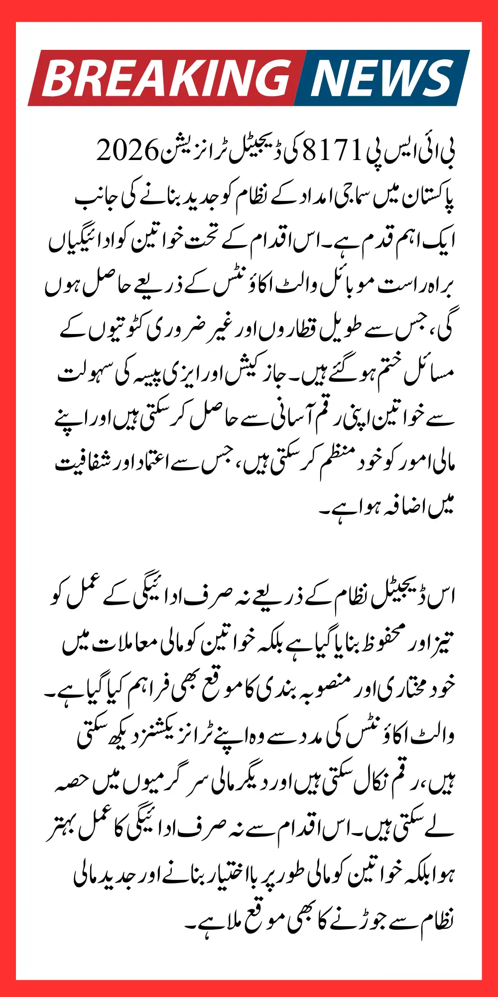 BISP 8171 recognized that the traditional cash-based payment system had several limitations that affected beneficiaries, especially women. Many recipients faced long queues, delays, and deductions at payment centers. These challenges created frustration and often delayed access to essential financial support. To address these issues, BISP decided to move to a fully digital payment system that is secure, efficient, and transparent.