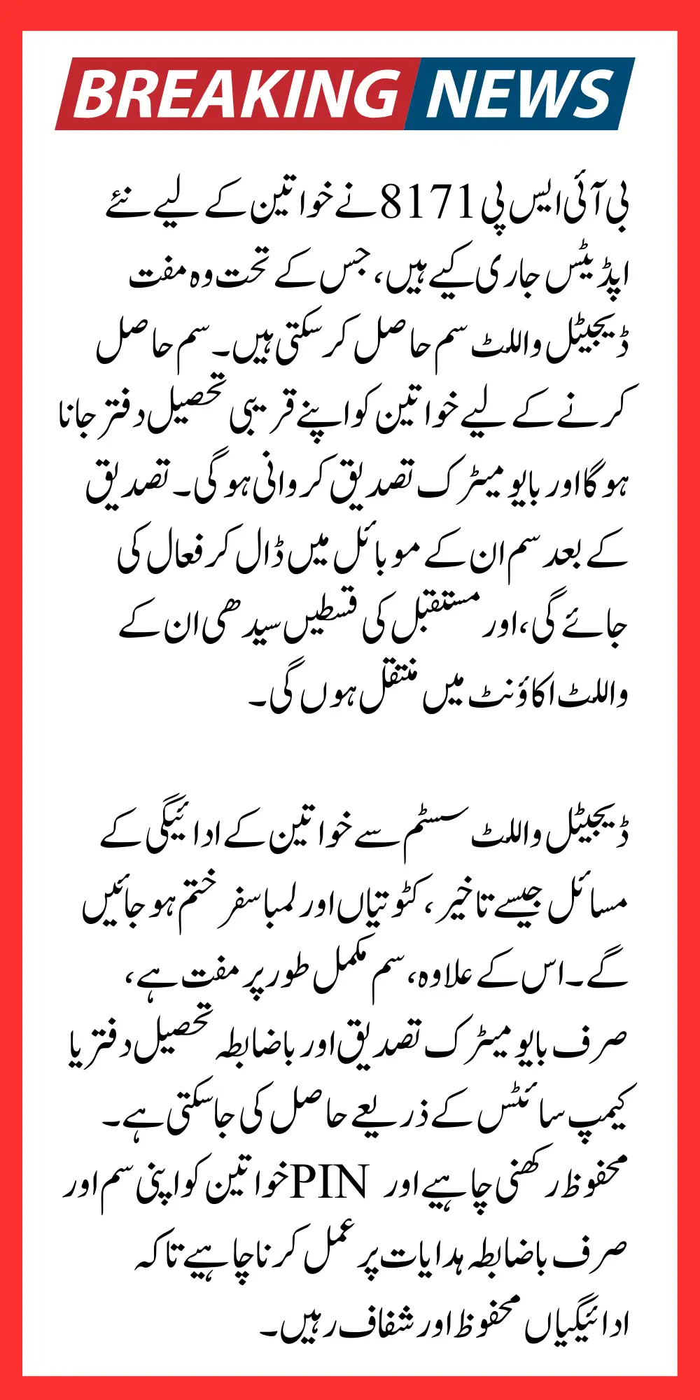 BISP 8171 has released a digital wallet system for deserving women, allowing them to receive payments directly and safely. Women can get a free SIM from their nearest Tehsil Office after completing biometric verification. Once the SIM is activated in their mobile phone, future BISP installments are transferred straight to the wallet. This system removes issues like payment delays, deductions, and long travel, while keeping transactions secure and transparent. Beneficiaries must follow official instructions and keep their SIM and PIN safe.