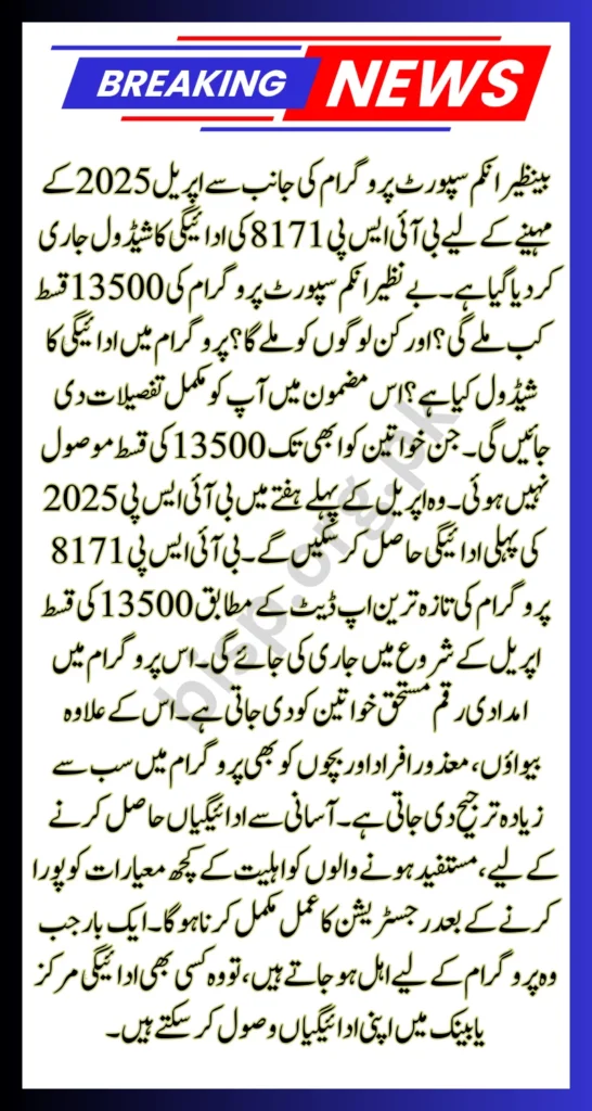 BISP 8171 April 2025: The payment schedule for BISP 8171 for the month of April 2025 has been released by the Benazir Income Support Program. When will the 13500 installment of the Benazir Income Support Program be received? And which beneficiaries will get it? What is the payment schedule set in the program? Complete details will be given to you in this article. Women who have not yet received the 13500 installment. They will be able to receive the first payment of BISP 2025 in the second week of April. According to the latest update of the BISP 8171 program, the 13500 installment will be released in early April.