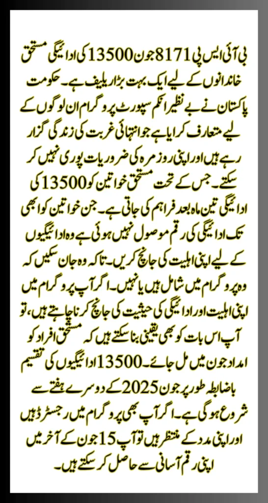 بے نظیر انکم سپورٹ پروگرام ایک بہت بڑا امدادی پروگرام ہے جو پورے پاکستان میں کم آمدنی والے خاندانوں کی مدد کرتا ہے۔ اس پروگرام کے تحت، اہل افراد کو تین ماہ کے بعد ادائیگی کی رقم مل جاتی ہے۔ 13500 ادائیگیوں کی قسط باضابطہ طور پر 15جون سے 30 جون2025 تک جاری رہے گی۔ جن افراد کو ابھی تک 2025 میں بے نظیر انکم سپورٹ پروگرام کی قسط موصول نہیں ہوئی ہے وہ اپنی قسط وصول کر کے عید کی خوشیوں میں شامل ہو سکیں گے.