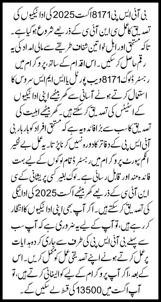 people can verify the August 2025 payment themselves from home through CNIC without any hassle. If you are also waiting for your payments, then it is important for you to first complete your verification process by following the instructions issued by BISP. After that, if you qualify for the program, you will be able to take the installment of 13500. Otherwise, you will not be provided with this amount of assistance. This article will tell you how you can complete your verification using your identity card through the BISP 8171 web portal or other services.