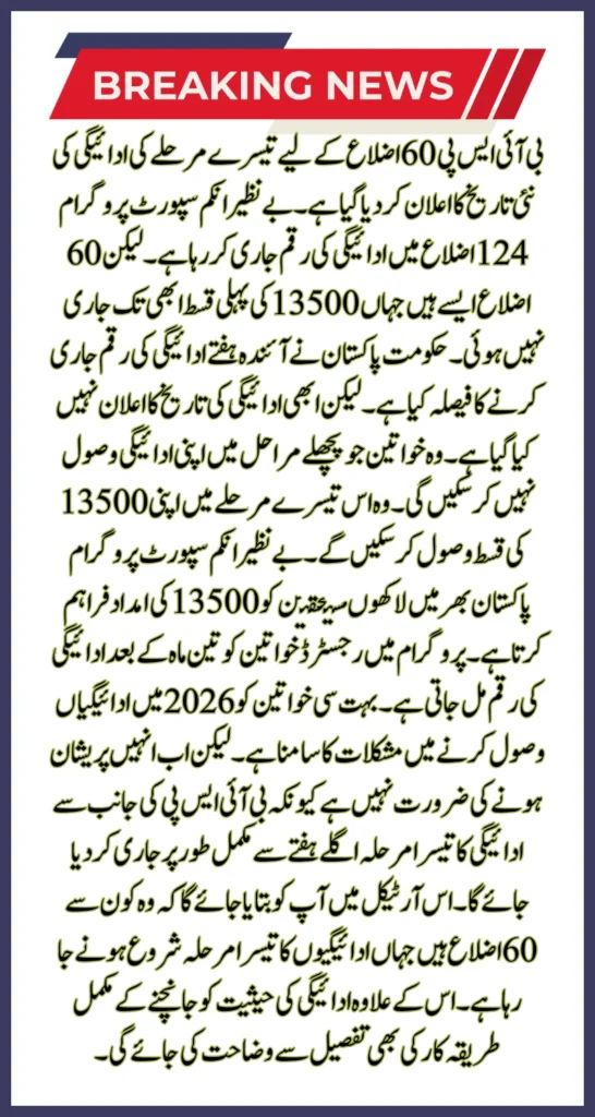 Benazir Income Support Program provides assistance of 13500 to millions of beneficiaries across Pakistan. Women registered in the program receive their payment amount after three months. Many women are facing difficulties in receiving payments in 2026. But now they need not worry because the third phase of payment by BISP will be fully released from next week. In this article, you will be told which are the 60 districts where the third phase of payments is going to start. Apart from this, the complete procedure to check the status of the payment will also be explained in detail.