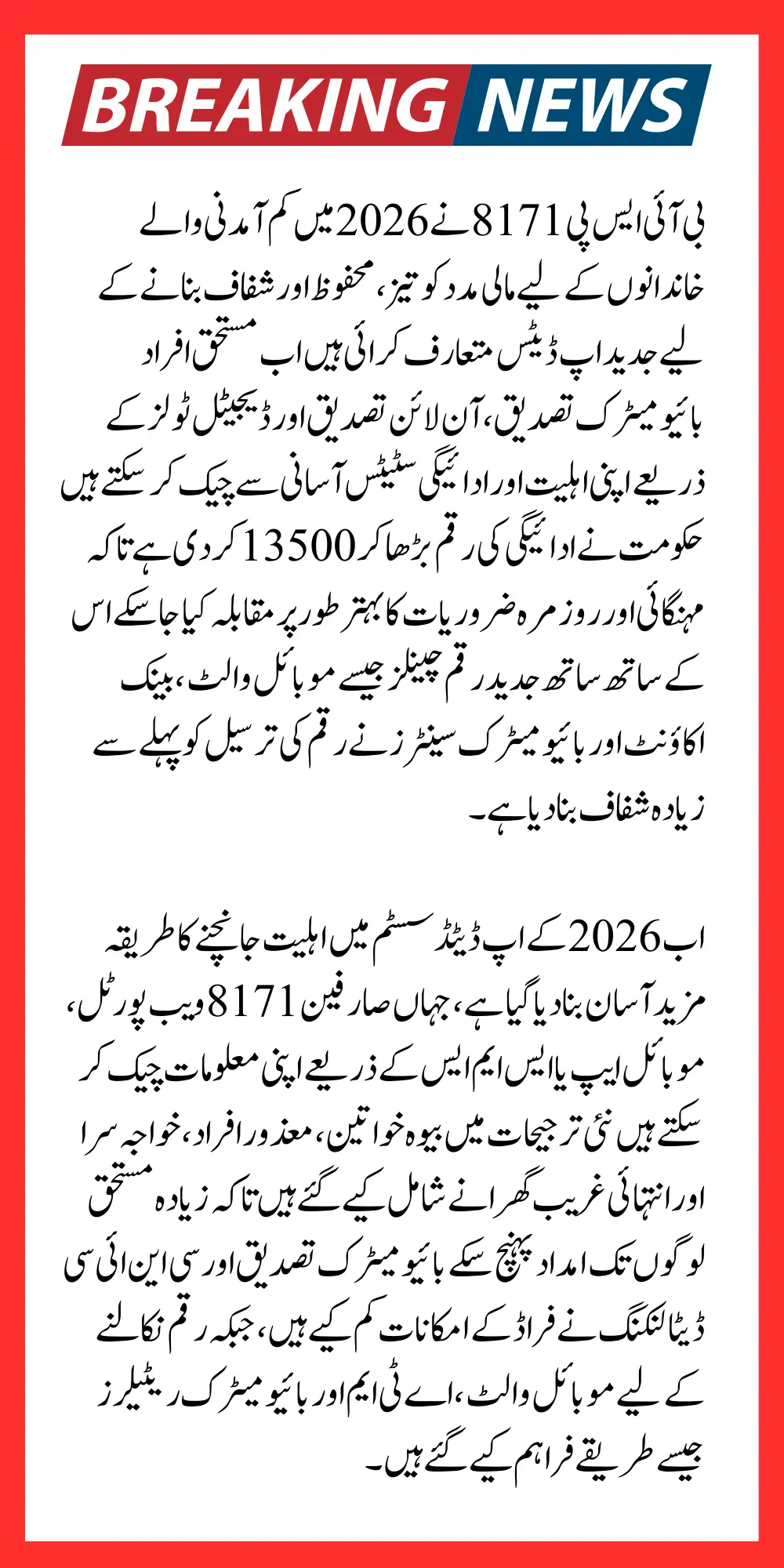 The new updates also include enhanced biometric verification simple online procedures and user-friendly digital tools With increased payments and modern withdrawal options the 2026 model improves transparency and reduces the complications that many families previously faced this article provides a complete guide to online verification eligibility checks registration steps and payment methods under BISP 8171.
