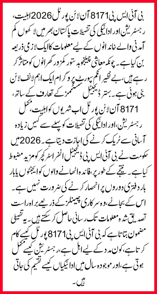 BISP 8171 Online Portal 2026 Eligibility, Registration & Payment Details reflects the government’s commitment to transparent and inclusive social protection. Through digital verification, structured payments, and updated surveys, BISP continues to support millions of deserving families.