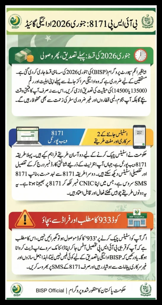 January 2026 BISP 8171 Payment Status Check By Online Portal & SMS Method is a major concern for millions of families across Pakistan who depend on financial assistance from the Benazir Income Support Programme. As the new year begins, the government has activated updated verification systems to help beneficiaries confirm whether their quarterly installment has been released, delayed, or placed under review. To make the process easy and transparent, BISP continues to offer two official verification methods: the 8171 online portal and the 8171 SMS service. This article provides a complete, step-by-step explanation of both methods, payment details, verification issues, refund procedures, and security guidelines.