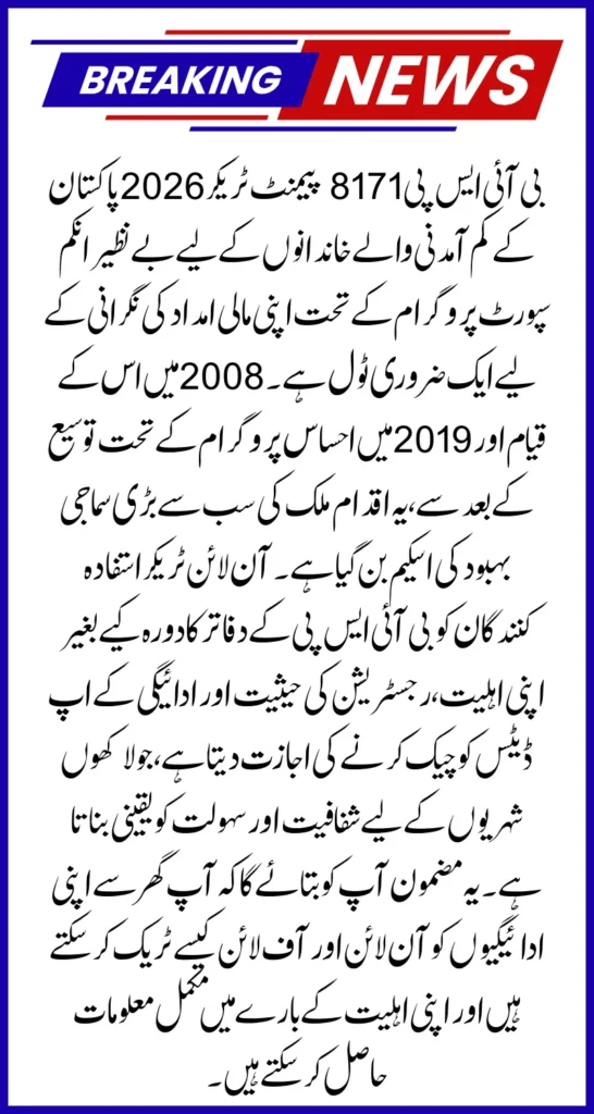 The BISP 8171 Payment Tracker 2026 provides a transparent, reliable, and accessible way for low-income households to receive financial support. By offering online and SMS-based tracking, the program ensures timely disbursement of funds to female-led households and reduces administrative burdens. Programs like Ehsaas Kafalat and Taleemi Wazaif further empower beneficiaries, promoting social development and improving educational outcomes. Pakistan’s commitment to digitalizing social welfare programs ensures that the BISP 8171 initiative continues to make a significant impact, helping millions of citizens lead better lives with dignity and financial stability.