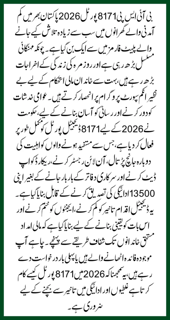 One of the biggest advantages of the BISP 8171 Portal 2026 is the ability to recheck eligibility online within minutes. This service is completely free and available nationwide.