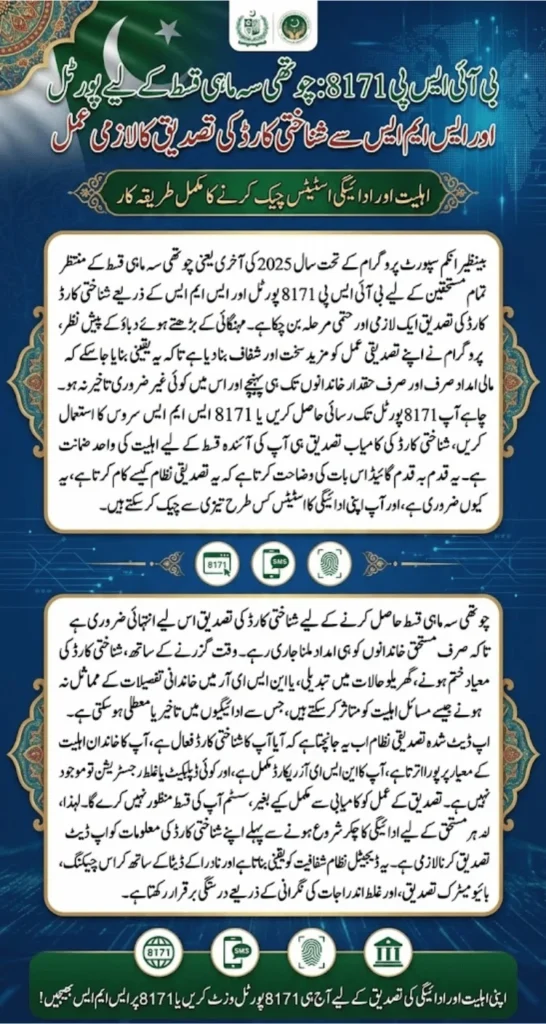 | Verification Methods | Portal (8171.bisp.gov.pk) & SMS (8171) |