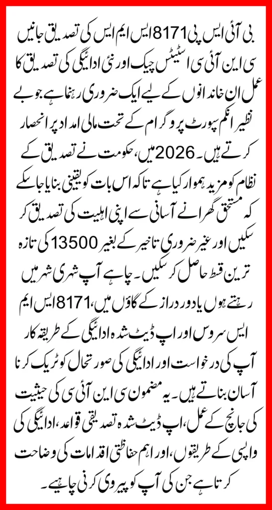 BISP 8171 SMS Verification Know CNIC Status Check & New Payment Verification Process is an essential guide for families who depend on financial assistance under the Benazir Income Support Program. In 2026, the government has further streamlined the verification system to ensure that deserving households can easily confirm their eligibility and receive the latest 13500 installment without unnecessary delays. Whether you live in an urban city or a remote village, the 8171 SMS service and updated payment procedures make it easier to track your application and payment status. This article explains the CNIC status check process, updated verification rules, payment withdrawal methods, and important safety measures you must follow.