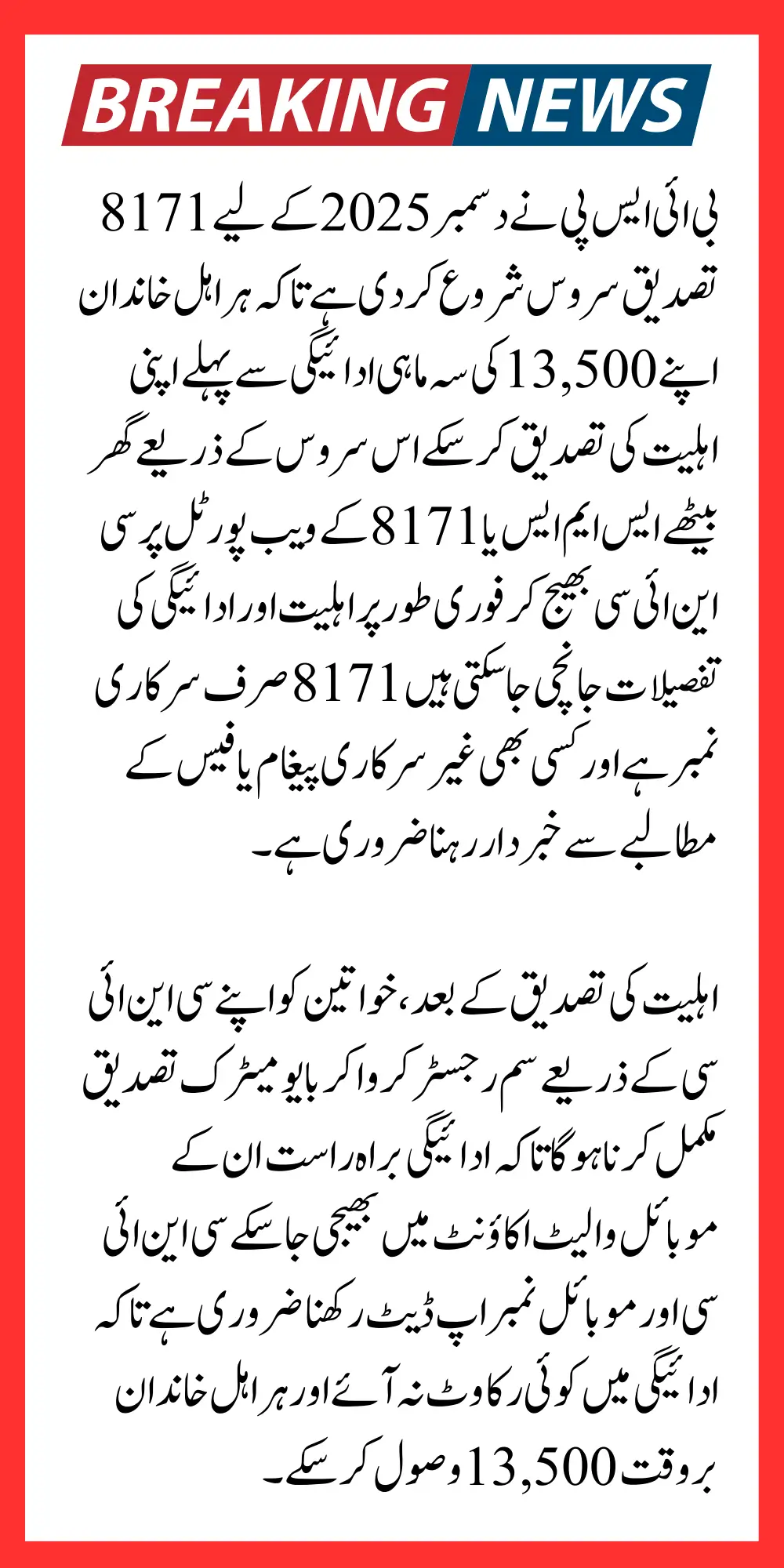 BISP 8171 verification for December 2025 is essential for every household to ensure the timely receipt of the Rs. 13,500 quarterly stipend by using the official SMS 8171 service or the web portal, beneficiaries can check eligibility update records and resolve common issues proactively.