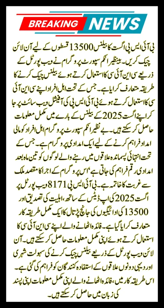 The aim of issuing this program is to eradicate poverty from the country. Along with the updates of August 2025 on the BISP 8171 web portal, a complete procedure for verifying eligibility and checking payments of 13500 has been introduced. Beneficiaries can get their complete information using their CNIC. The facility of checking balance through an online web portal has been provided to beneficiaries of both urban and rural areas. In this method, the beneficiaries can receive their complete information in their preferred language.