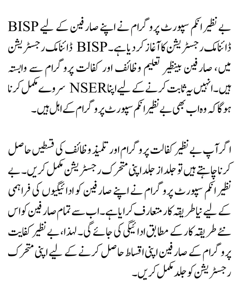 According to the new update of the Benazir Income Support Program, a dynamic NSER survey has started for all eligible users of the Benazir Kafalat Program. It has announced that those receiving assistance from the Benazir Kafalat program should re-do their dynamic NSER survey before 2025. If they do not complete the survey, their 8171 payments will withheld by the BISP program.