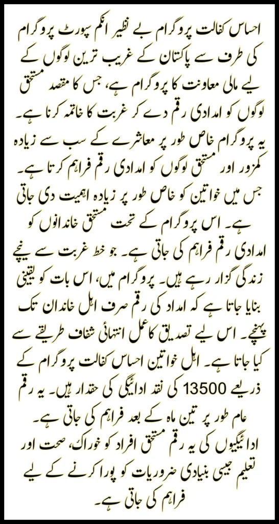 Therefore, the verification process is done in a very transparent manner. Eligible women are entitled to a cash payment of 13500 through the Ehsaas Kafalat programme. This amount is usually provided after three months. This amount of payments is provided to the deserving people to meet their basic needs like food, health and education.